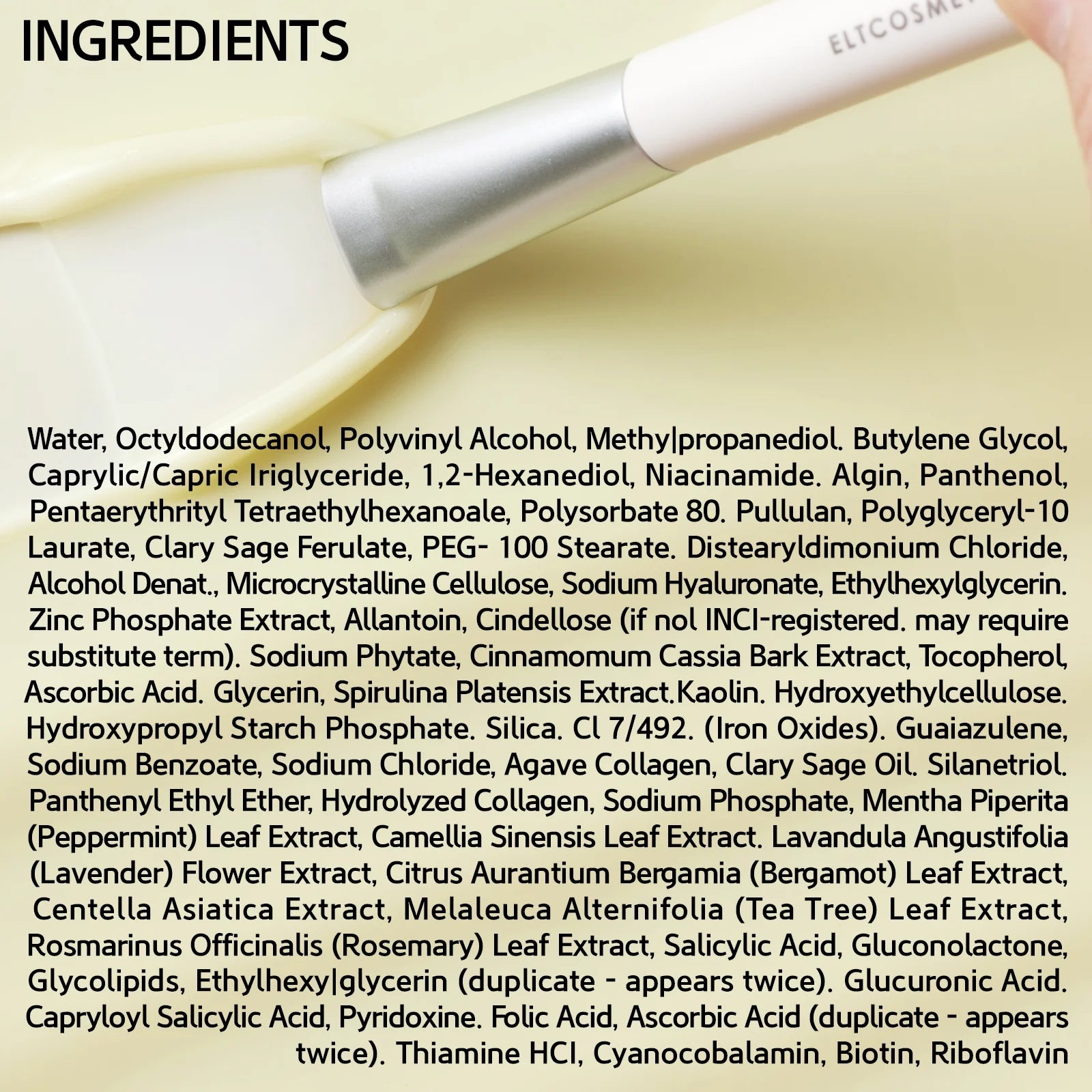 Ascorbic Acid (Vitamin C), 5 Types of Collagen, 8-PEP Complexes, Panthenol, Niacinamide 2%, Adenosine 0.04%